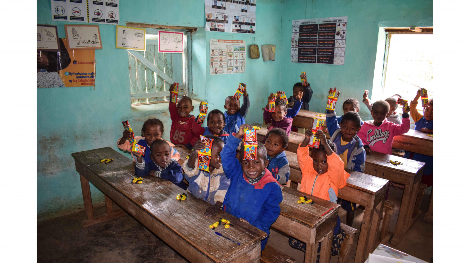 A Tataonimpianaka, Baibondro, Ambondrona Andina, Ambalandratsiafaka, Toareny, Vohibary, Iherimaro, Ambohibory, des centaines d’enfants ont été gâtés grâce aux dons offerts par leurs parrains et marraines respectifs : friandises, cartables, savons…